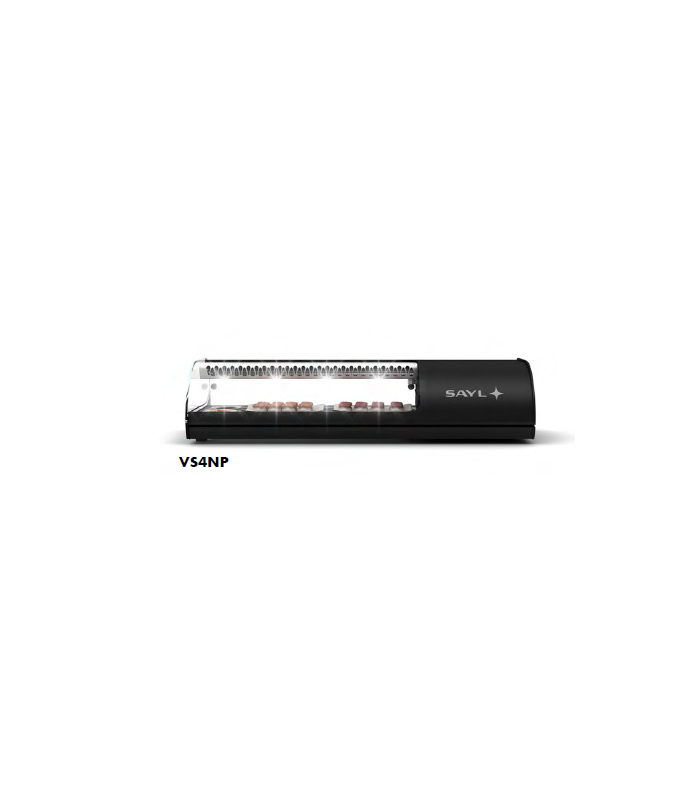Vitrine de présentation pour tapas, froid positif +2°C / +6°C avec panneaux coulissants en plexiglass arrières et vitre avant galbée relevable. Idéale pour les pros de la restauration.